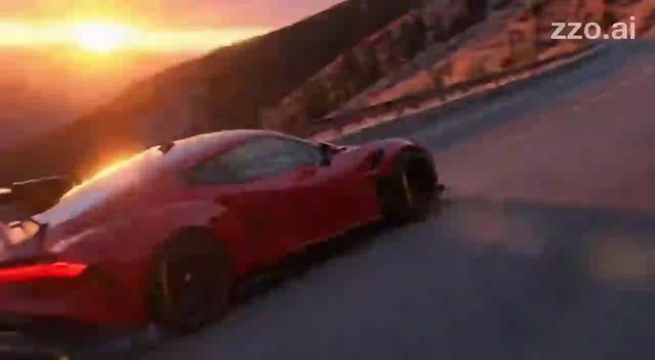 "A high-speed red sports car drifting tightly around a corner on a mountain road at sunset. Smoke is rising from the tires as they skid across the asphalt. The audio features the loud roar of the engine revving up and the high-pitched screeching sound of tires struggling for grip."