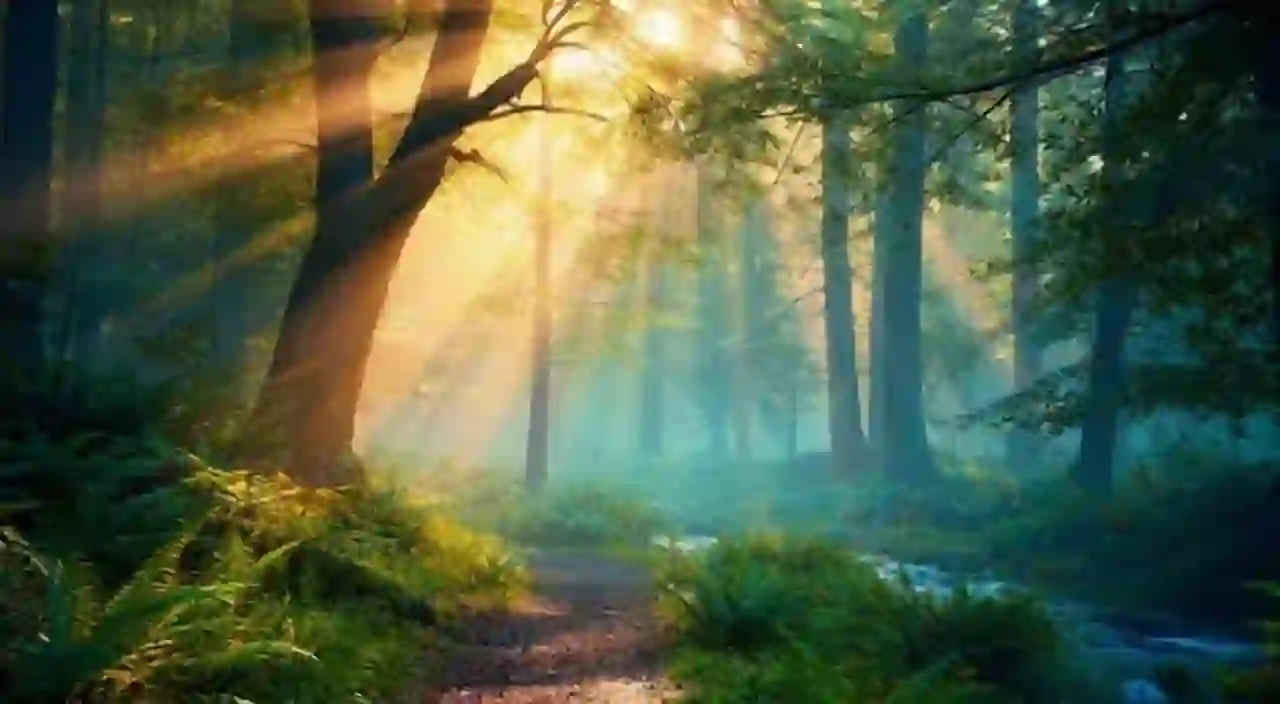 "Early morning in a lush, misty forest. Golden sunlight filters through the green canopy, creating god rays. The scene is peaceful with leaves gently rustling in the breeze. The audio captures the immersive sound of birds singing clearly and the soft rustle of wind through the trees."