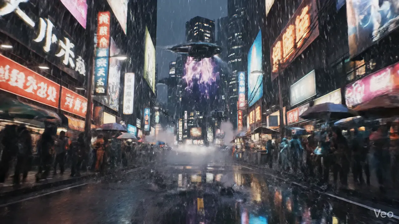 "A futuristic cyberpunk city at night, rain falling on neon-lit streets. Flying cars zoom past towering skyscrapers with holographic advertisements. The camera moves forward through the busy street level. Reflections of neon lights on the wet pavement are hyper-realistic. Blade Runner aesthetic, volumetric fog, high contrast, cinematic lighting."