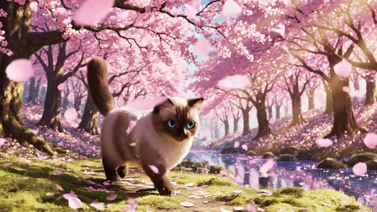 "A high-quality 3D animation style scene of a cute fluffy cat walking through a magical cherry blossom forest. Pink petals are falling gently around it. The cat has large expressive eyes and soft fur texture. Soft pastel lighting, dreamy atmosphere, Studio Ghibli inspired art style."