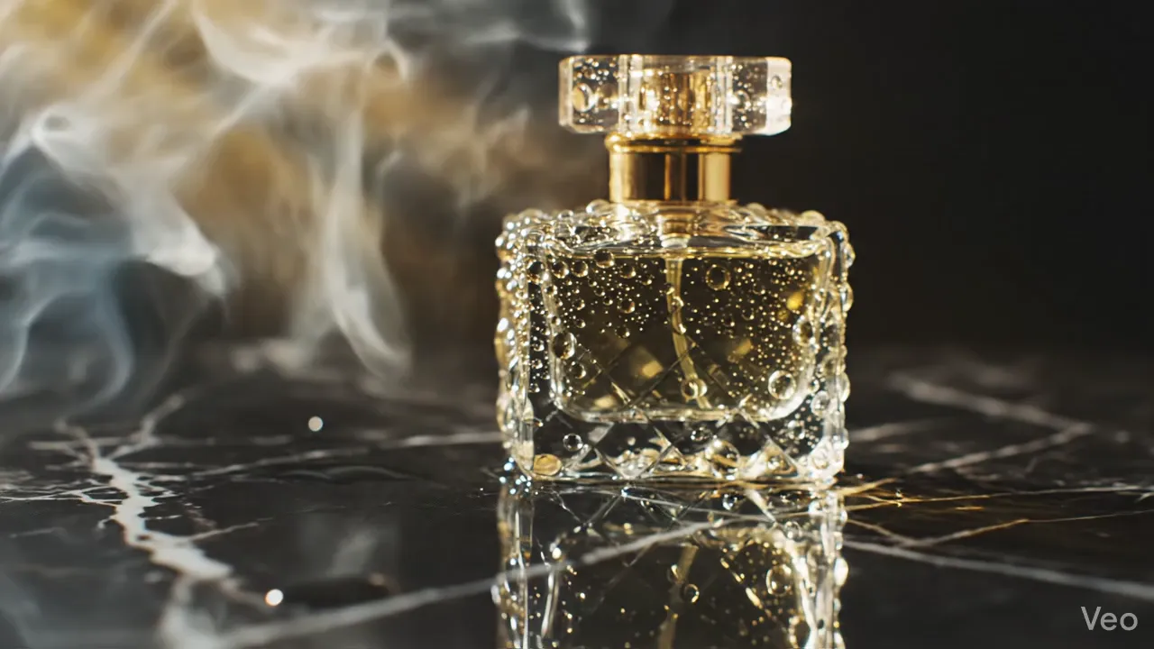 "A cinematic close-up of an elegant glass perfume bottle resting on a black marble surface. Golden light rays filter through smoke in the background. The bottle reflects the light beautifully. Water droplets on the bottle surface. Commercial product videography, 4k, macro lens, shallow depth of field."