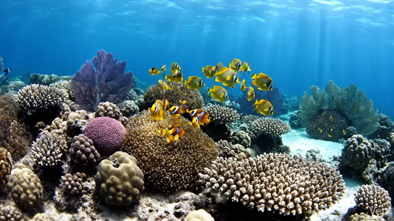 "A vibrant underwater coral reef scene with colorful tropical fish swimming peacefully. Sunlight beams penetrate through the clear blue water, illuminating the textures of the coral. 4k resolution, relaxing atmosphere, highly detailed marine life."